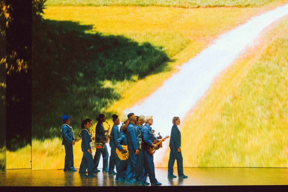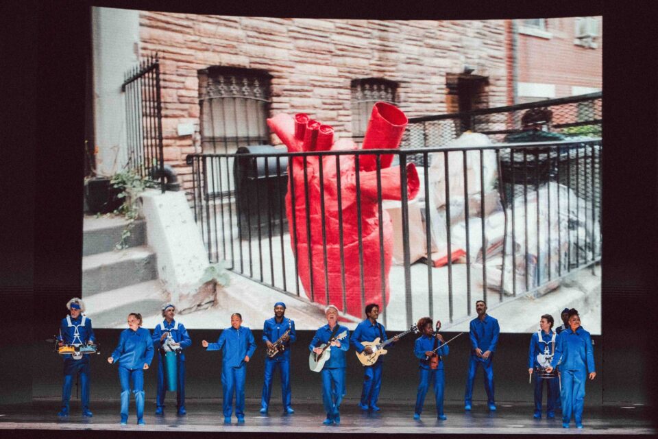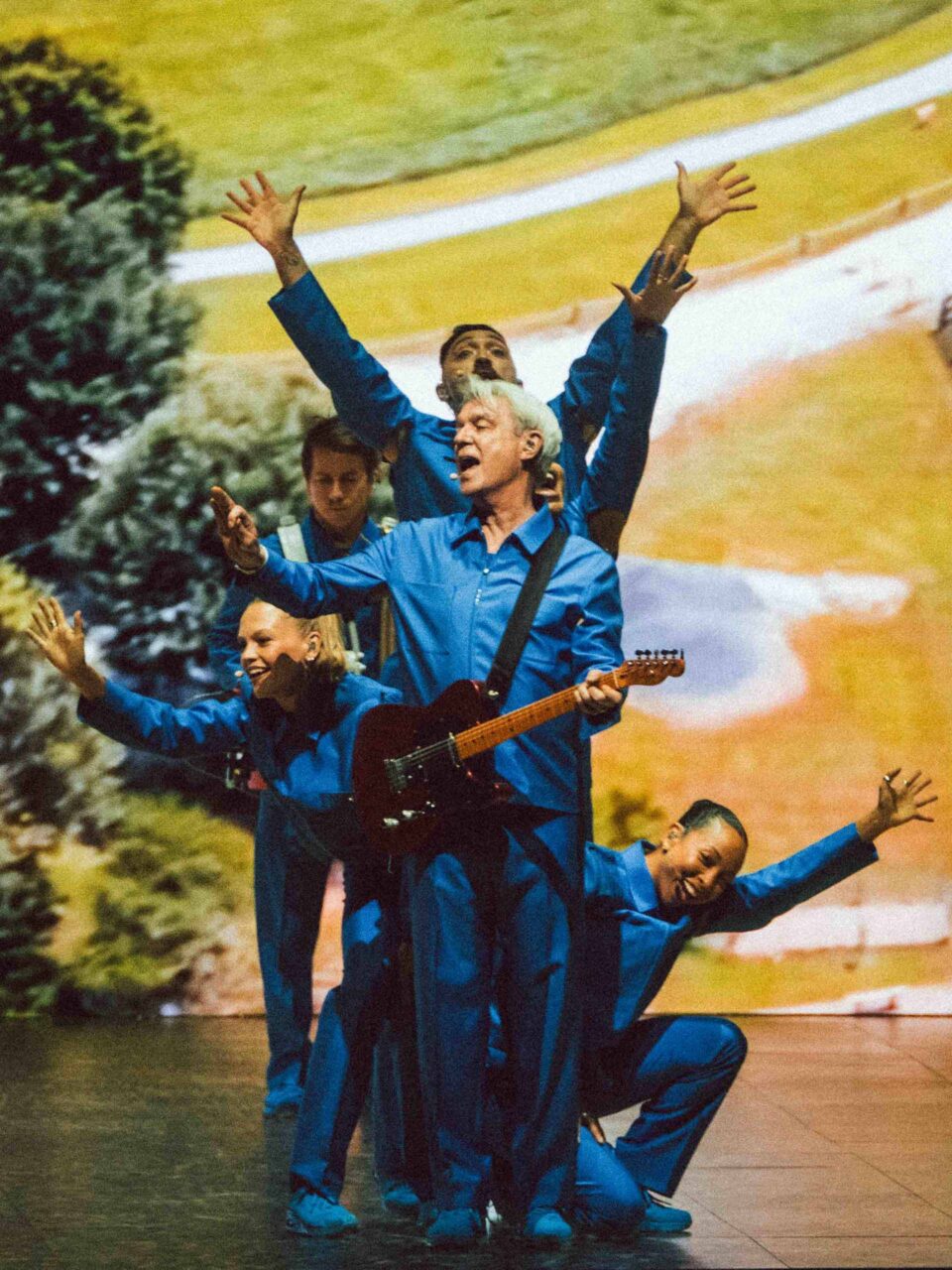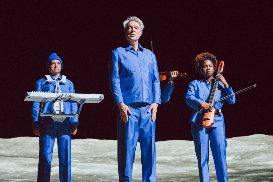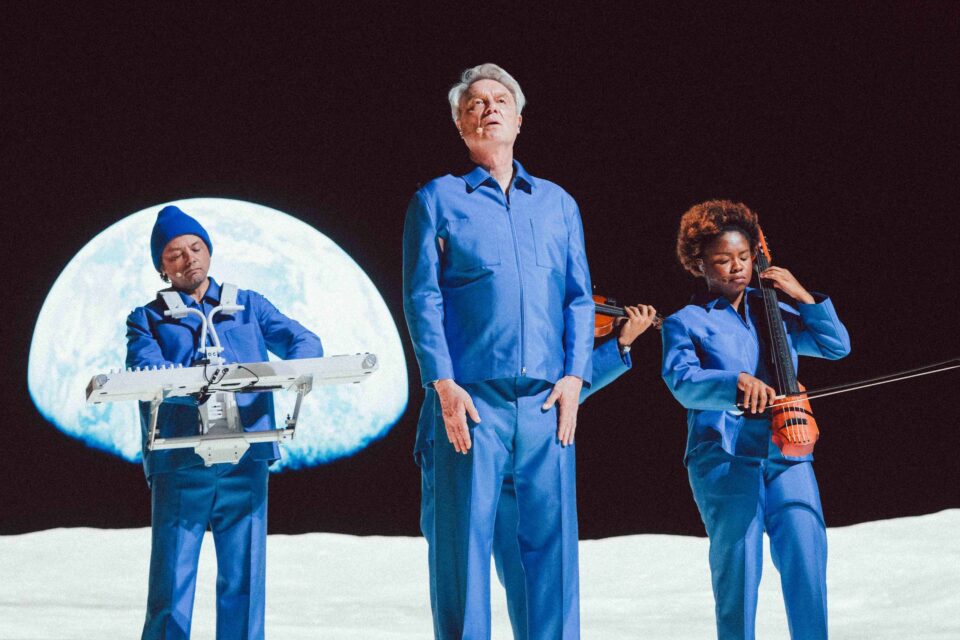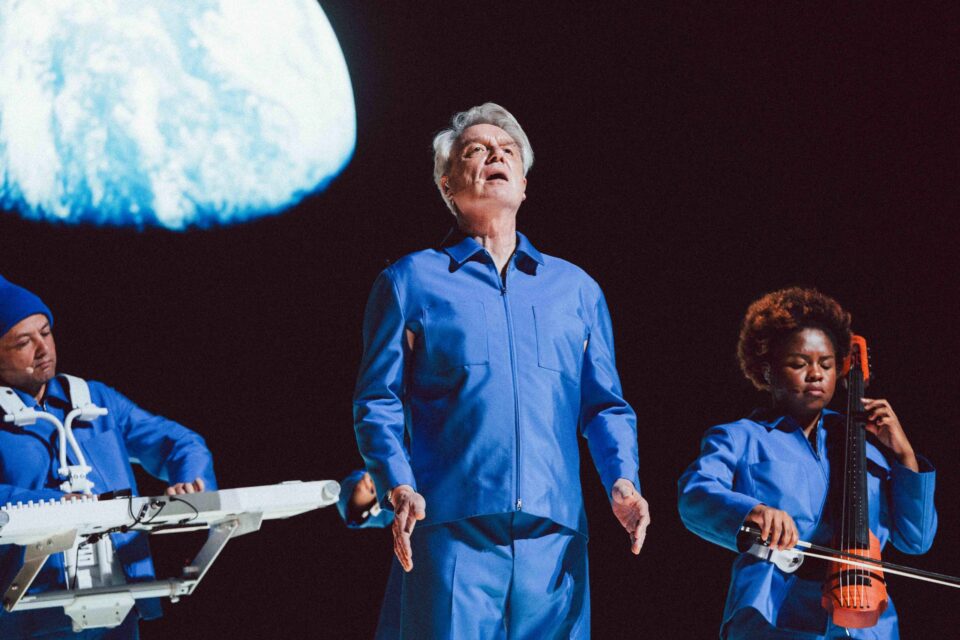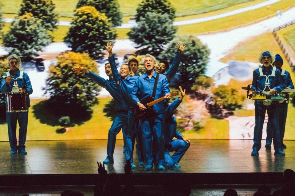 David Byrne took the stage in New York City last night in support of his eleventh solo album, Who Is the Sky?, with a sensational hometown show at Radio City Music Hall. Picking up where his “Utopia” tour left off, his band is once again all dressed in light blue and constantly in motion, along with a massive floor-to-ceiling curved video screen that’s perfectly synchronized with each track. In addition to songs from the new album, the set list was packed with Talking Heads classics such as “Heaven,” “Houses in Motion,” and “Psycho Killer,” closing the night with a powerful encore of “Burning Down the House.”