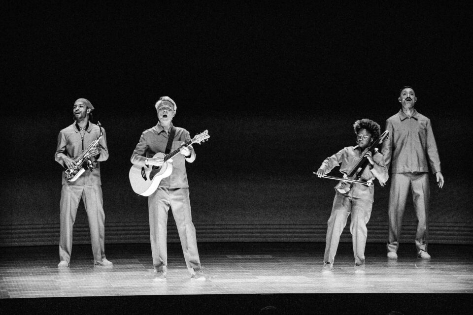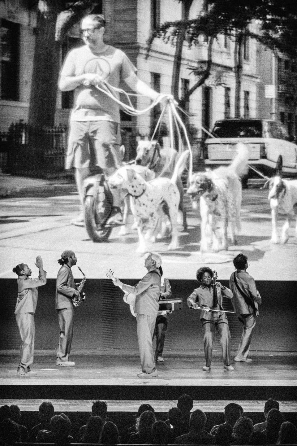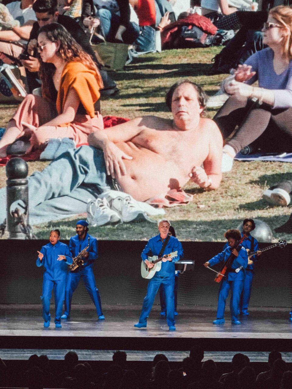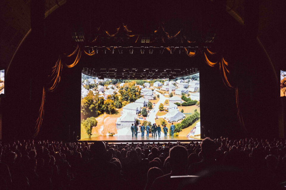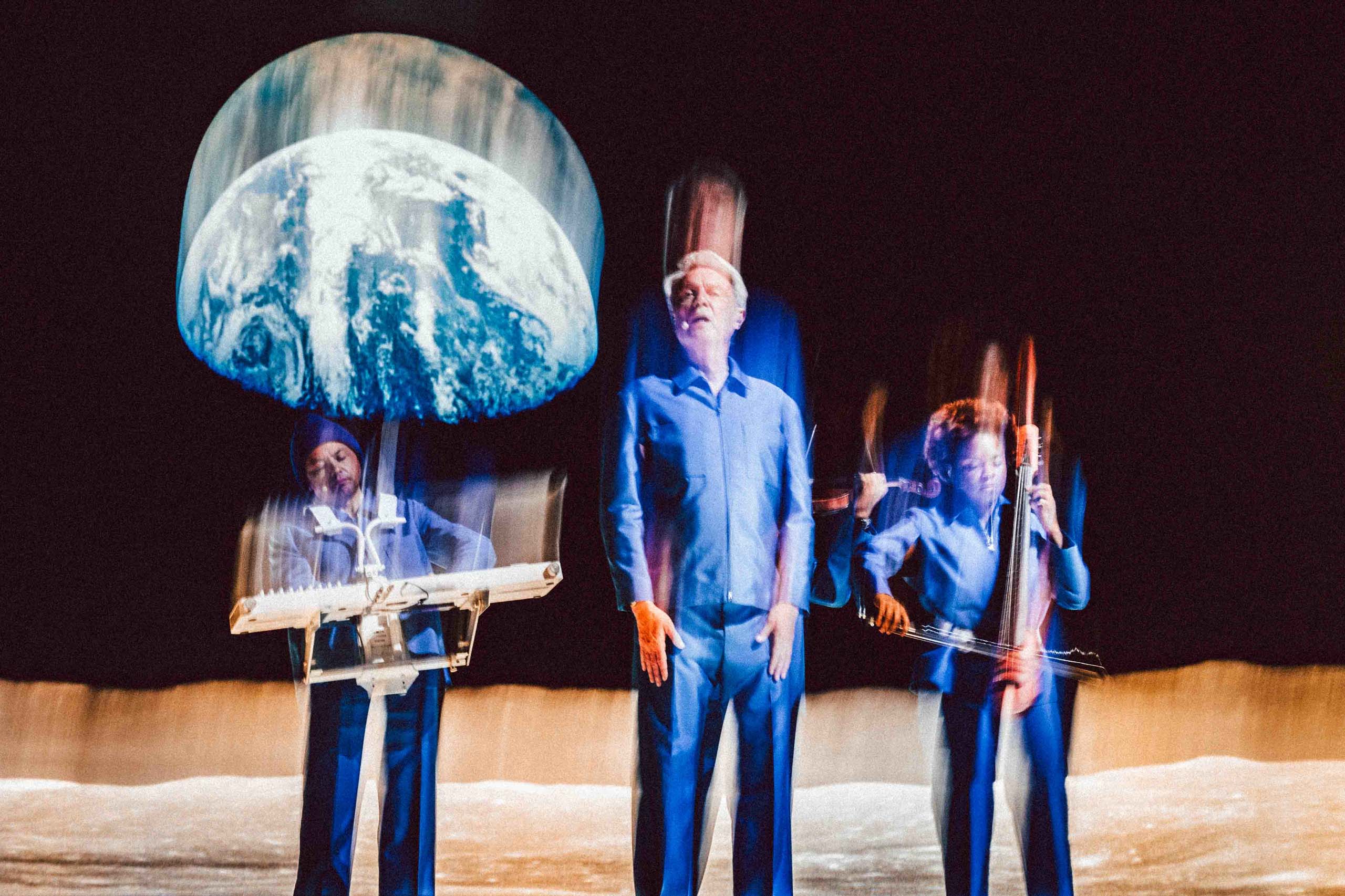 David Byrne took the stage in New York City last night in support of his eleventh solo album, Who Is the Sky?, with a sensational hometown show at Radio City Music Hall. Picking up where his “Utopia” tour left off, his band is once again all dressed in light blue and constantly in motion, along with a massive floor-to-ceiling curved video screen that’s perfectly synchronized with each track. In addition to songs from the new album, the set list was packed with Talking Heads classics such as “Heaven,” “Houses in Motion,” and “Psycho Killer,” closing the night with a powerful encore of “Burning Down the House.”