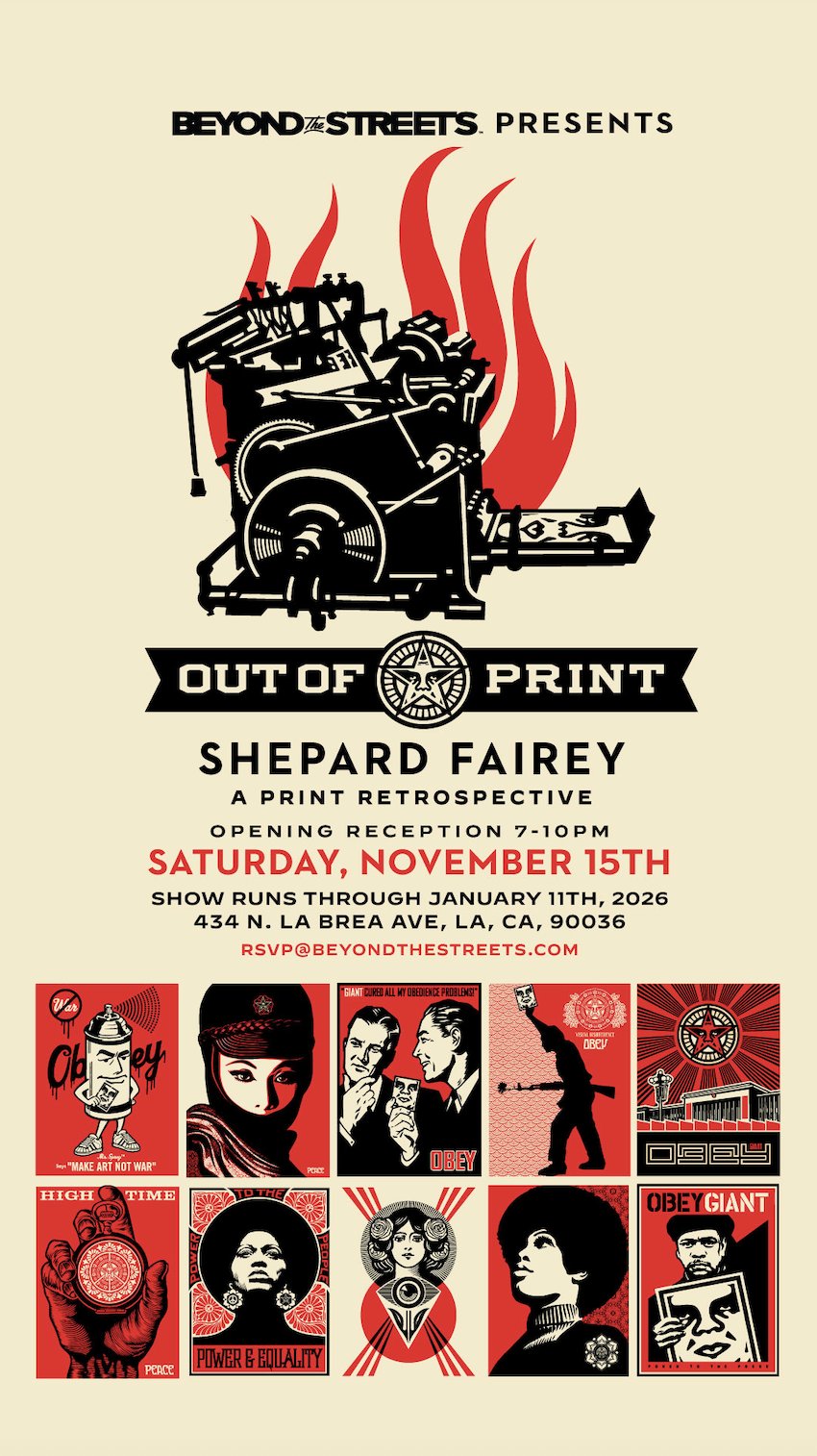 Beyond the Streets has announced a new exhibition spotlighting renowned artist Shepard Fairey entitled Out of Print. According to a press release, the exhibition will feature over 400 original screen prints along with “new and re‑mixed works” blending screen printing and stenciling. “The exhibition surveys Fairey’s enduring commitment to the image, the multiple, and the power of mass communication,” reads the summary.