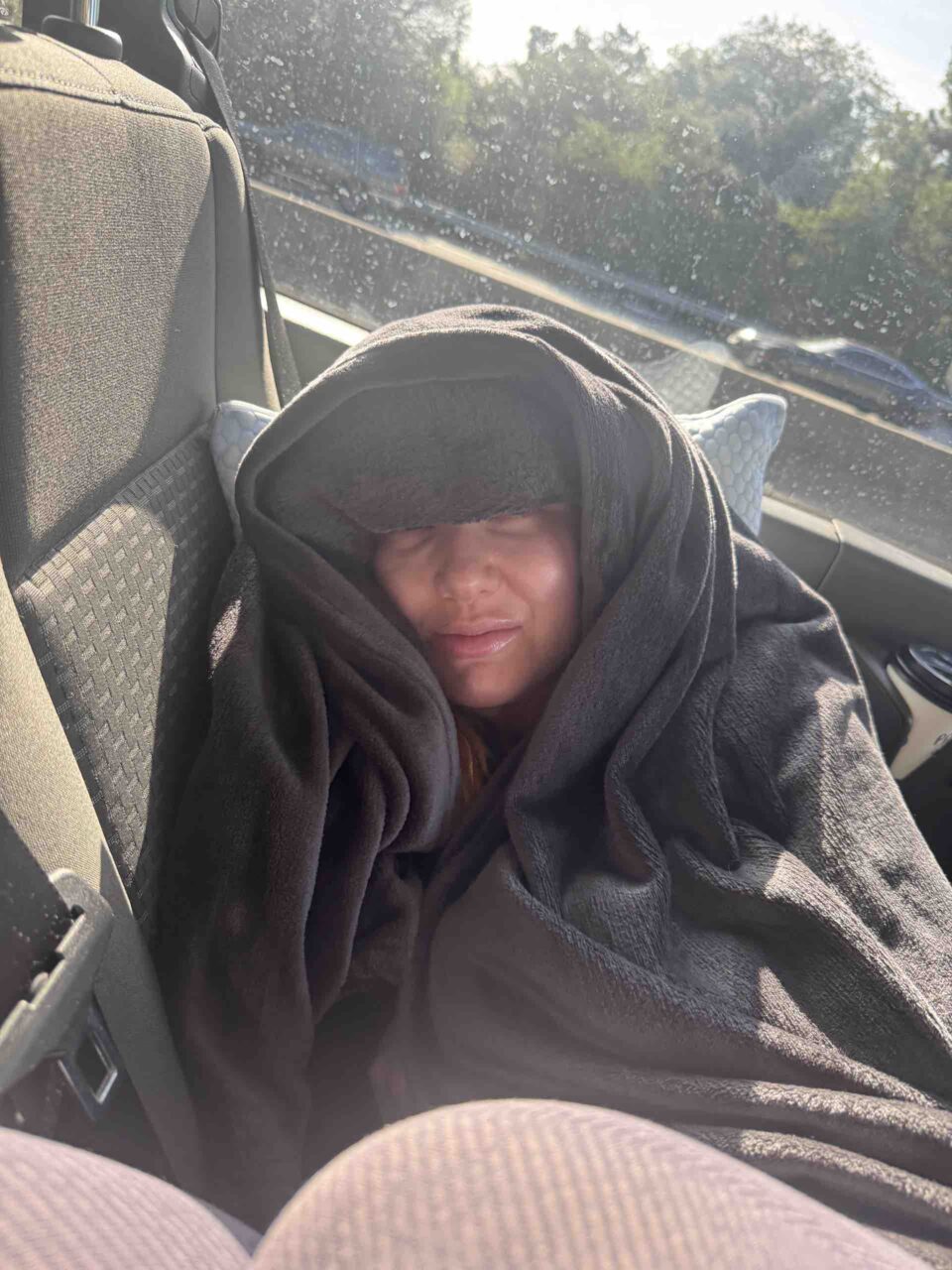 (Left) Freddy successfully takes a nap while the caravan makes its way up to Northern California and beyond; (right) Haute unsuccessfully attempts a nap while the West Coast leg commences.