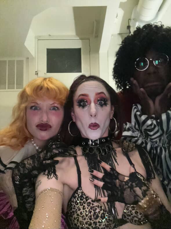 Troubadour aftermath: dressing room hugs and happy tears. Iyana and Kyra seen on couch having a much-needed rest after blowing the roof off with their dance to “Big Spender.” Melissa Maskan, our manager, seen in full jester get up happily following the night’s dress code. Haute’s mom in full embrace of Haute after traveling from Texas. Brian, our TM, seen beaming with glee in the background. Freddy with pure delight seen on right hydrating.