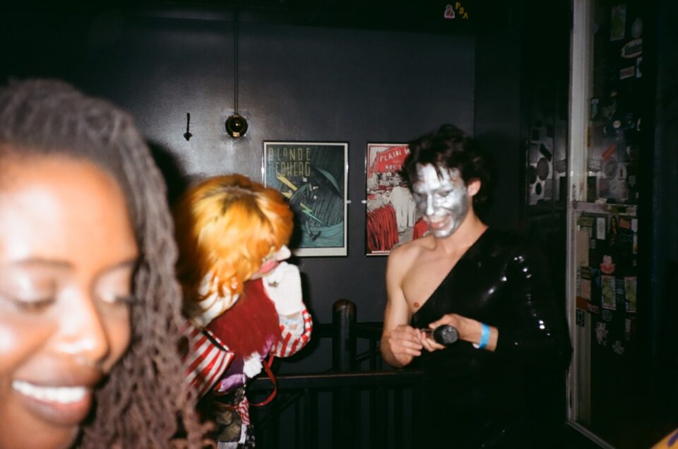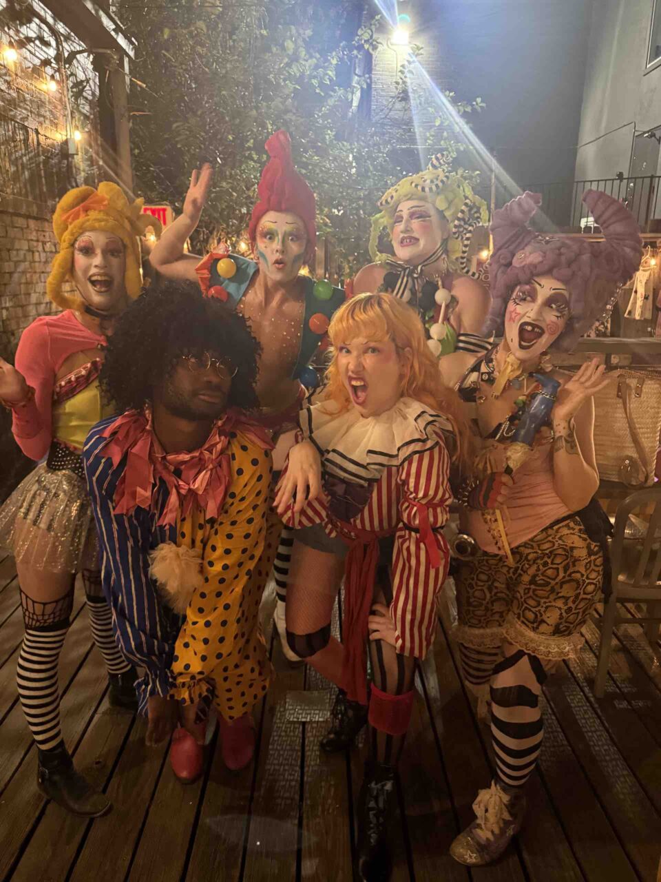Fou York joins the band backstage at The Bowery in NYC in a merry photo before taking the stage to perform their delightful clown routine to “Do You Want to Touch” by The Runaways.