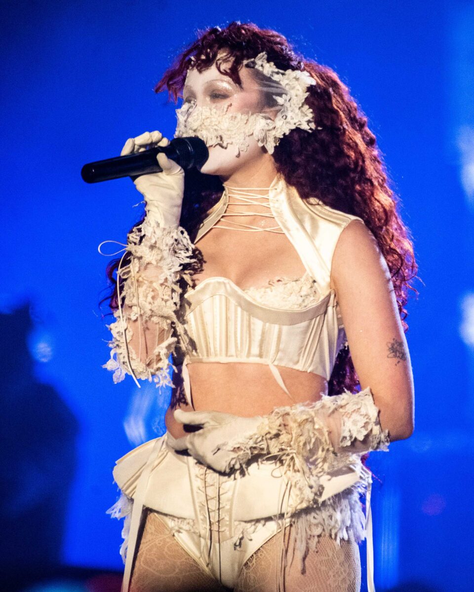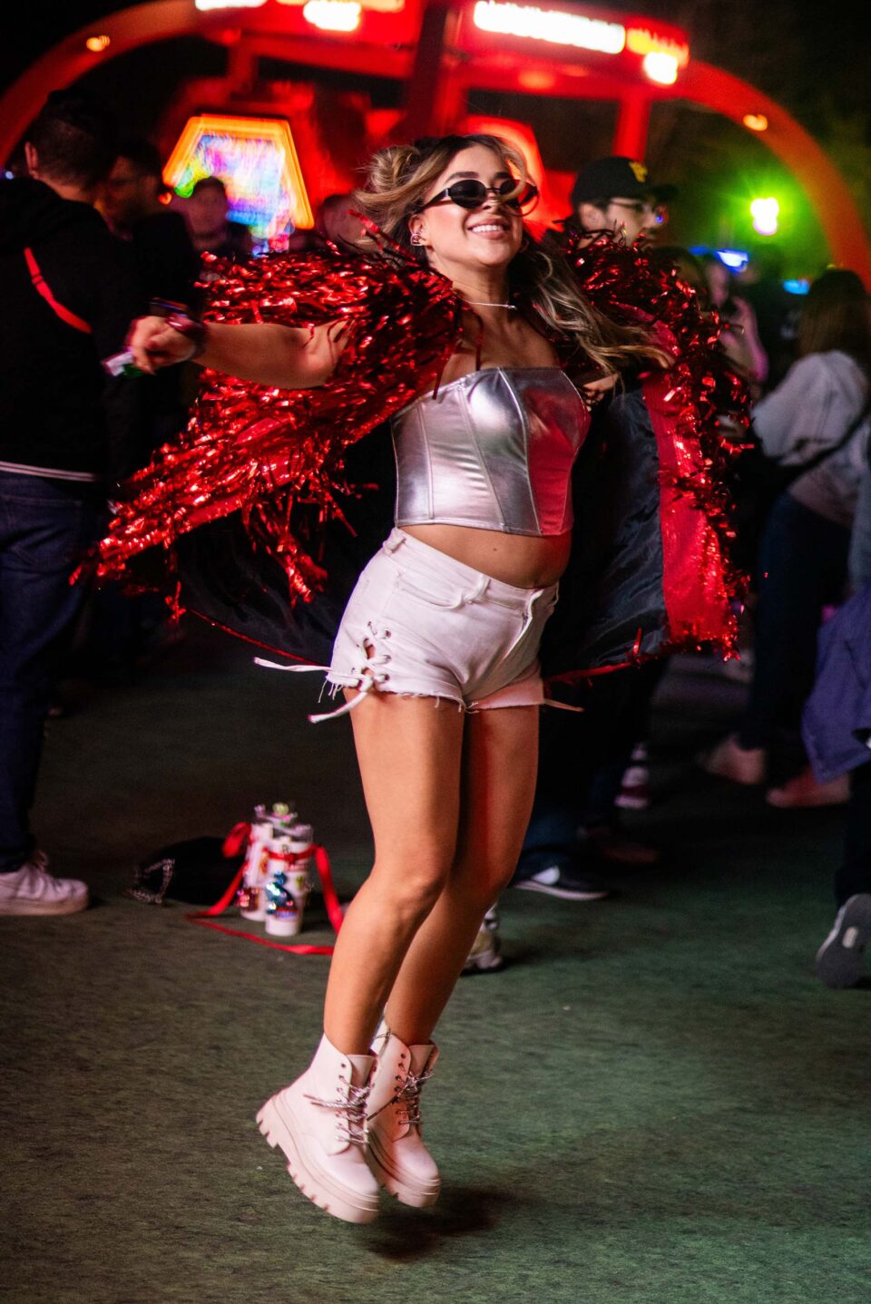 While paper crowns celebrating Corona Beer’s 100th anniversary were the most common accessory on the festival grounds, Pink Pony Club fashion dominated the event’s second day, headlined by Chappell Roan. Fans were thrilled for the pop star’s first show in the country, and many resonated with the LGBTQ+ visibility she brings to the contemporary pop stage (the crowd even chanted “lesbinas” multiple times throughout her set). She was dressed as a banshee with blood coming from her gums, entering at first with a long wedding dress and veil that felt right out of a Guillermo del Toro film, taking off and putting on more layers on the theme throughout her set. She joked that she could only be this ghastly in front of a Mexican audience.