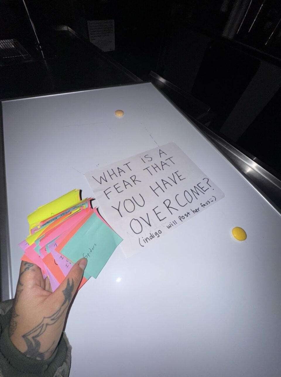 Indigo: I’ve been asking a question at every show on this tour and leaving sticky notes for people’s answers. It has been a really sweet way to connect and learn about my listeners. Everyone’s answers are so wildly different, and also sometimes really similar. It’s fun to see how people respond.