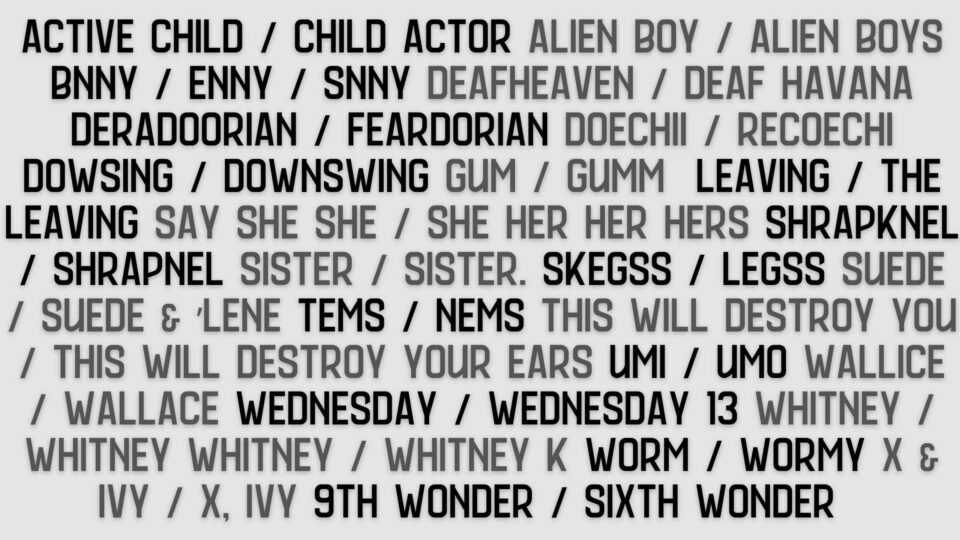 Deradoorian and FearDorian, Triathlon and Marathon, Skegss and Legss, and more sets of artists that have surprisingly little in common.